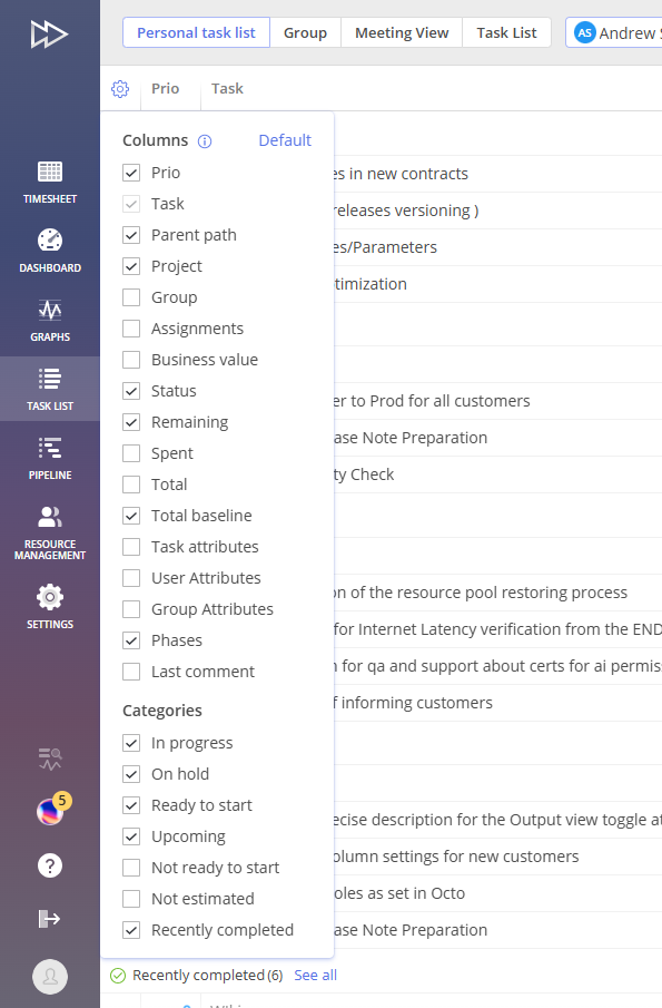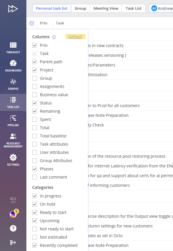 You can search for a necessary task by the item’s name, project’s name or group’s name in the Personal Task List tab given all categories are enabled and there are different tasks belonging to different categories.