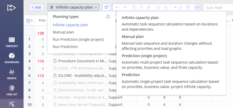 - Infinite Capacity Planning (Infinite capacity plan) is the functionality that automatically calculates the best possible way of executing tasks taking into account their duration and relations.
