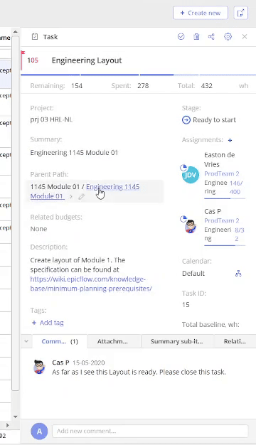 Commenting functionality makes it possible to share project-related information directly in Epicflow within the project team.